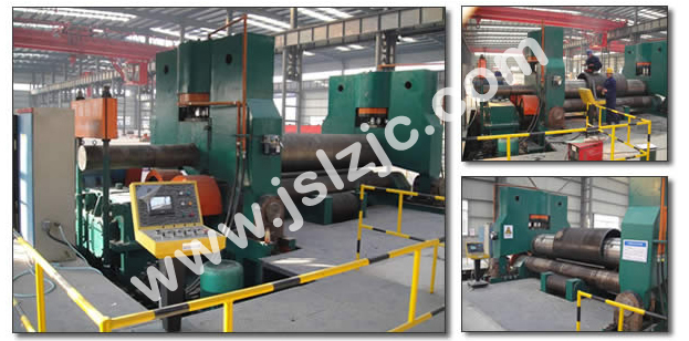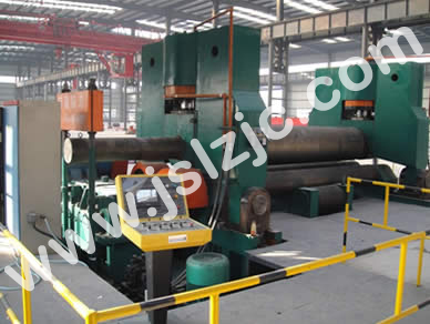 液压自动卷圆机结构形式为三辊对称式,上辊在两下辊中央对称位置通过液压缸内的液压油作用于活塞作垂直升降运动,通过主减速机的末级齿轮带动两下辊齿轮啮合作旋转运动,为卷制板材提供扭矩。规格平整的塑性金属板通过液压自动卷圆机的三根工作辊(二根下辊、一根上辊)之间,借助上辊的下压及下辊的旋转运动,使金属板经过多道次连续弯曲,产生永久性的塑性变形,卷制成所需要的园筒、锥筒或它们的一部分。该自动液压卷圆机缺点是板材端部需借助其它设备进行预弯。液压自动卷圆机适用于卷板厚度在50mm以上的大型卷板机,两下辊下部增加了一排固定托辊,缩短两下辊跨距,从而提高卷制工件精度及机器整体性能。