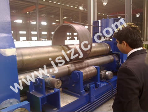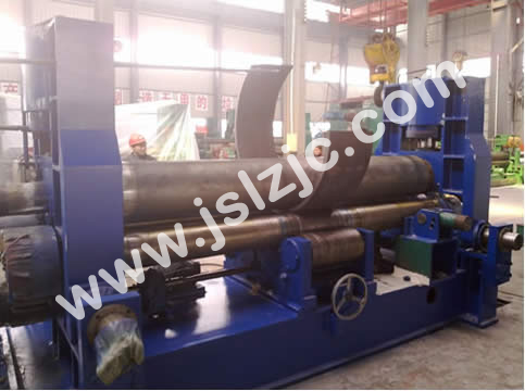三辊卷管机结构型式为三辊非对称式,上辊为主传动,下辊垂直升降运动,以便夹紧板材,并通过下辊齿轮与上辊齿轮啮合,同时作为主传动;边辊作倾升降运动,三辊卷管机具有预弯和卷圆双重功能。